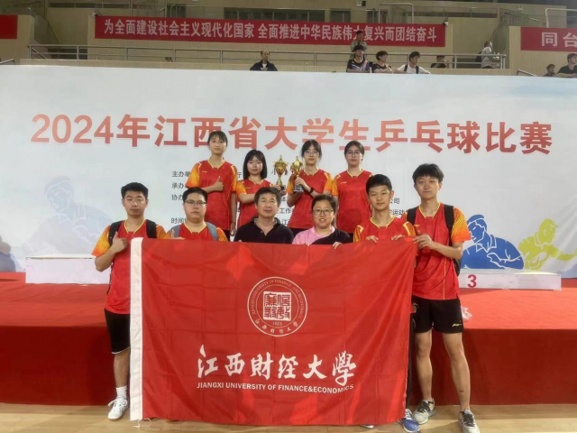 From May 26th to 31st, 2024 Jiangxi Province College Students Table Tennis Competition was held in Wuyuan County, Shangrao. JUFE students achieved excellent results once again in the fierce competition with more than 40 undergraduate and vocational college in the province. The table tennis team was led by the deputy secretary of School of sports, Zhan Xinhuan, with Zhao Jianqiang Geng Xiaoxiao as the coaching instructors. The team won a total of eight awards, including fourth place in men's undergraduate group (Qi Ziming, Yuan Haijun, Liu Peiyan, Xie Jinzhi), eighth place in women's undergraduate group (He Danqing, Luo Xin, Yang Linxi, Luo Yiying), second place in men's undergraduate doubles (Liu Peiyan, Xie Jinzhi), fifth place in men's undergraduate doubles (Qi Ziming, Yuan Haijun), seventh place in women's undergraduate doubles (Luo Xin, Yang Linxi), seventh place in men's undergraduate singles (Liu Peiyan), and seventh place in women's undergraduate singles (He Danqing). Coaches Zhao Jianqiang Geng Xiaoxiao were awarded the title of "Excellent Coach", and student Qi Ziming was named the "Sportsmanship Athlete". This competition further tested the significant effectiveness of our talent training model, while also showcased the development results of "Integrated Sports Teaching Course Reform of Learning, Practice, and competition". In the future, we will continue to adhere to the concept of cultivating outstanding and innovative talents, and continuously improve the high-quality development of sports teaching, training andcompetition.